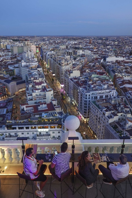 Spain, Madrid, Panoramic view of central Madrid by night. Madrid city skyline. At the Hotel Riu in the Edificio Espańa, in Plaza de Espańa, there is a rooftop with 360-degree panoramic views of Madrid, Credit:Fabio Mazzarella / Avalon