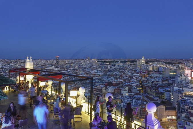 Spain, Madrid, Panoramic view of central Madrid by night. Madrid city skyline. At the Hotel Riu in the Edificio Espańa, in Plaza de Espańa, there is a rooftop with 360-degree panoramic views of Madrid, Credit:Fabio Mazzarella / Avalon