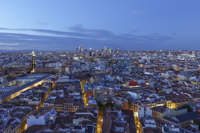 Spain, Madrid, Panoramic view of central Madrid by night. Madrid city skyline, Credit:Fabio Mazzarella / Avalon