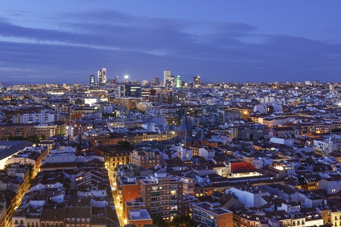 Spain, Madrid, Panoramic view of central Madrid by night. Madrid city skyline from the Riu Hotel rooftop, Credit:Fabio Mazzarella / Avalon
