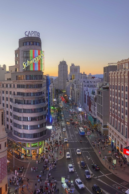 Spain, Madrid, Spain, Madrid, Gran Via Street with Edificio Capitol or Edificio Carrion, building with famous Schweppes sign., Credit:Fabio Mazzarella / Avalon