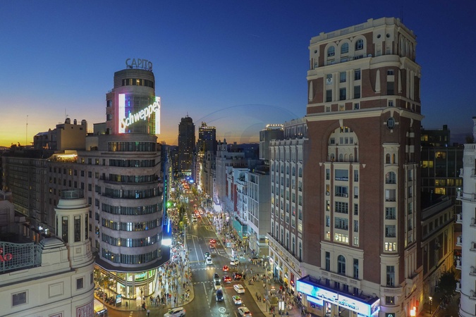 Spain, Madrid, Spain, Madrid, Gran Via Street with Edificio Capitol or Edificio Carrion, building with famous Schweppes sign, and Palacio de la Prensa, Credit:Fabio Mazzarella / Avalon