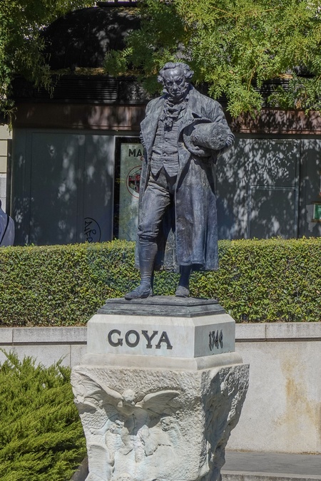 Spain, Madrid, Museo del Prado, officially known as Museo Nacional del Prado, is the main Spanish national art museum, located in central Madrid. Pictured: The statue of legendary spanish painter Francisco Goya, Credit:Fabio Mazzarella / Avalon