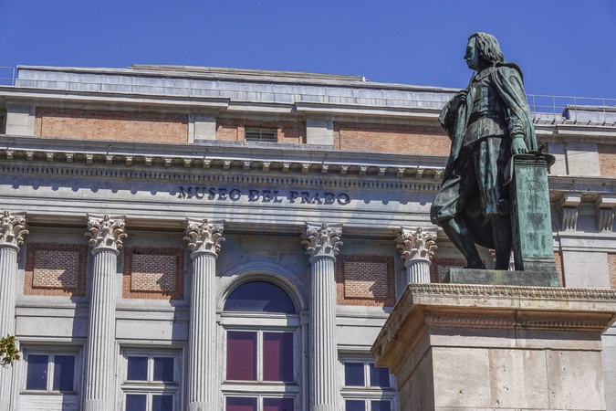 Spain, Madrid, Museo del Prado, officially known as Museo Nacional del Prado, is the main Spanish national art museum, located in central Madrid. Pictured: The statue of legendary spanish painter Francisco Goya, Credit:Fabio Mazzarella / Avalon