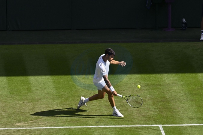 Carlos Alcaraz face à Oliver Tarvet (6-1, 6-4, 6-4) lors du tournoi de Wimbledon, le 2 juillet 2025. Carlos Alcaraz against Oliver Tarvet (6-1, 6-4, 6-4) at the Wimbledon tournament on July 2, 2025.