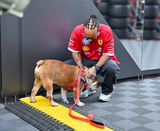 04 July 2025. Lewis Hamilton, Ferrari, with his Dog Roscoe after Free Practice Session 2 at the Formula 1 Qatar Airways British Grand Prix at Silverstone, Northamptonshire, UK., Credit:Lee Floyd / Avalon