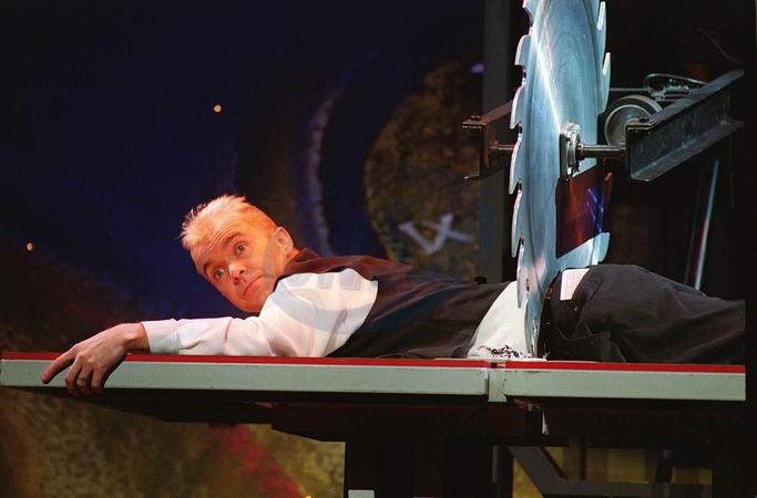 WAYNE DOBSONBritish MagicianDuring the Dress Rehearsal for the Children's Royal Variety Performance, 1994 at the London PalladiumBandphoto Agency PhotoB21 007631/C-24 24.04.1994Children's Royal Variety Performance 1994Dress RehearsalLondon Palladium, Argyll StreetIn aid of NSPCCPhoto callBeing sawn in half - Magic trick, Credit:© Band Photo / uppa.co.uk / Avalon