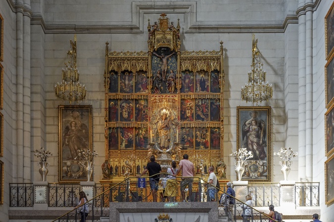 Spain, Madrid,The Cathedral of Saint Mary the Royal of the Almudena (Santa Maria la Real de La Almudena), commonly known as the Almudena Cathedral, built between 1883 and 1984. Pictured: The Neo-Romanesque crypt houses a 16th-century image of the Virgen de la Almudena.Photo Fabio Mazzarella/Sintesi *** Local Caption ***, Credit:Fabio Mazzarella / Avalon