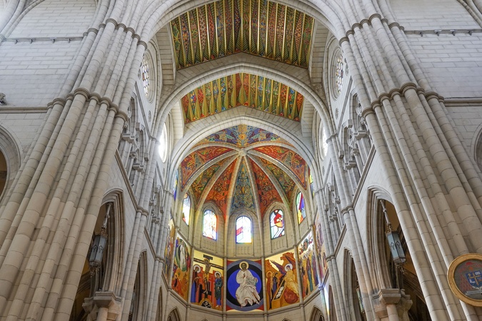 Spain, Madrid,The Cathedral of Saint Mary the Royal of the Almudena (Santa Maria la Real de La Almudena), commonly known as the Almudena Cathedral, built between 1883 and 1984. Inside dome - paintings and stained glassPhoto Fabio Mazzarella/Sintesi *** Local Caption ***, Credit:Fabio Mazzarella / Avalon