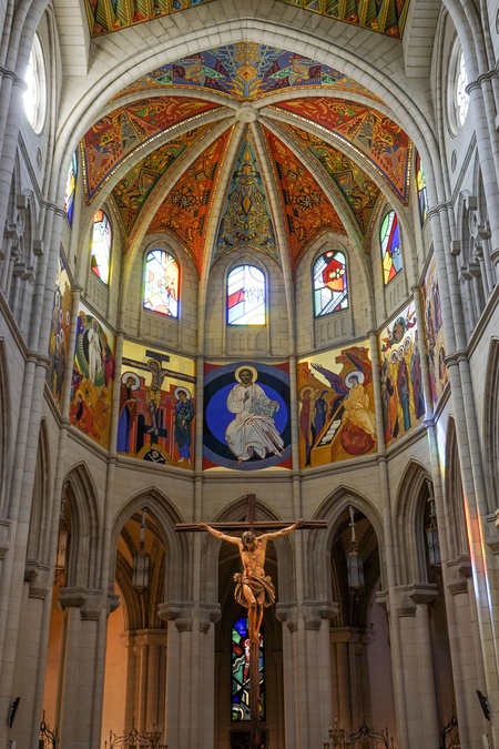 Spain, Madrid,The Cathedral of Saint Mary the Royal of the Almudena (Santa Maria la Real de La Almudena), commonly known as the Almudena Cathedral, built between 1883 and 1984. Inside dome - paintings and stained glassPhoto Fabio Mazzarella/Sintesi *** Local Caption ***, Credit:Fabio Mazzarella / Avalon