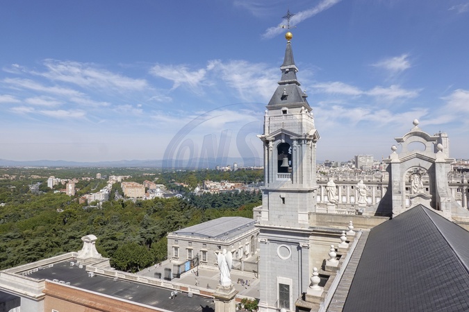 Spain, Madrid,The Cathedral of Saint Mary the Royal of the Almudena (Santa Maria la Real de La Almudena), commonly known as the Almudena Cathedral, built between 1883 and 1984. Pictured: View from the roof of Almudena Cathedral looking towards the Palacio RealPhoto Fabio Mazzarella/Sintesi *** Local Caption ***, Credit:Fabio Mazzarella / Avalon