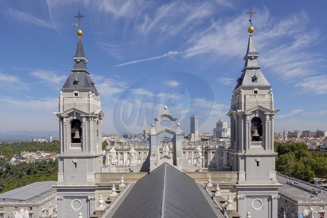 Spain, Madrid,The Cathedral of Saint Mary the Royal of the Almudena (Santa Maria la Real de La Almudena), commonly known as the Almudena Cathedral, built between 1883 and 1984. Pictured: View from the roof of Almudena Cathedral looking towards the Palacio RealPhoto Fabio Mazzarella/Sintesi *** Local Caption ***, Credit:Fabio Mazzarella / Avalon