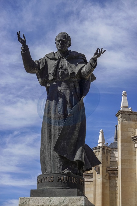 Spain, Madrid,The Cathedral of Saint Mary the Royal of the Almudena (Santa Maria la Real de La Almudena), commonly known as the Almudena Cathedral, built between 1883 and 1984. Pictured: Just outside Cathedral of Almundena there's a 3.5 metre tall statue of Pope John Paul II. The statue was sculpted by Juan de Avalos in 1998 to commemorate the Pope's consecration of the cathedral five years earlier.Photo Fabio Mazzarella/Sintesi *** Local Caption ***, Credit:Fabio Mazzarella / Avalon