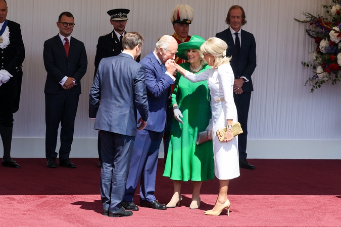 Król Anglii Karol III i Camilla Parker Bowles, królowa małżonka Anglii, witają francuską parę prezydencką, prezydenta Emmanuela Macrona i jego żonę, pierwszą damę Brigitte Macron, na Datchet Road w Windsor.