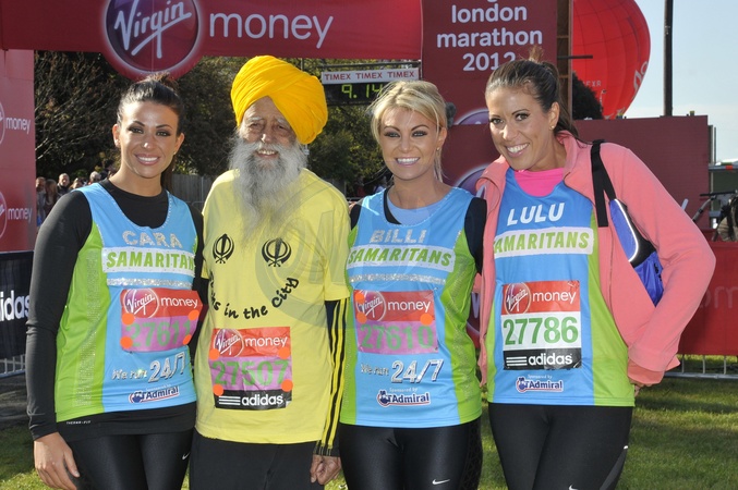 Cara Kilbey (left), Billi Mucklow & friend Lulu (Louise Laird) with oldest runner, 101 year old Fauja Singh, at the Start of The London Marathon at Blackheath on Sunday 22 April 2012., Credit:Sue Andrews / Avalon