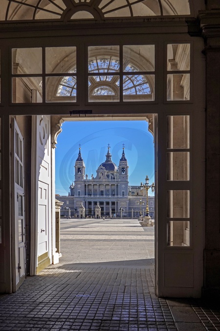 Spain, Madrid, View from Royal Palace entry door to the Santa Maria la Real de La Almudena Cathedral or Catedral de Santa Maria la Real de la Almudena, Credit:Fabio Mazzarella / Avalon