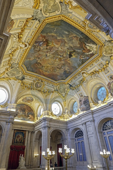 Spain, Madrid, Royal Palace of Madrid Palacio Real, Painted ceiling over the entrance staircase at the Royal palace, Credit:Fabio Mazzarella / Avalon