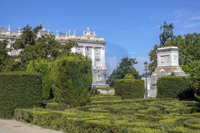 Spain, Madrid, the East gate of Royal Palace of Madrid Palacio Real in Plaza de Oriente Square with Monument to Felipe IV, Credit:Fabio Mazzarella / Avalon