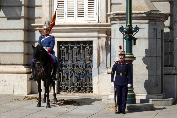 Spain, Madrid, Royal Guard at the East gate of Royal Palace of Madrid Palacio Real in Plaza de Oriente Square, Credit:Fabio Mazzarella / Avalon