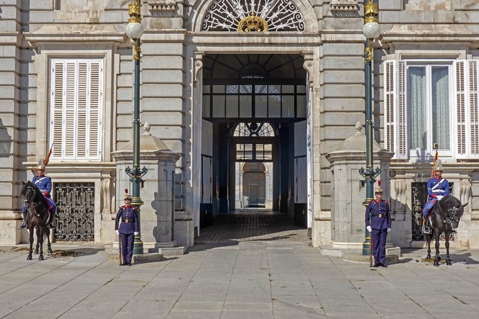 Spain, Madrid, Royal Guard at the East gate of Royal Palace of Madrid Palacio Real in Plaza de Oriente Square, Credit:Fabio Mazzarella / Avalon