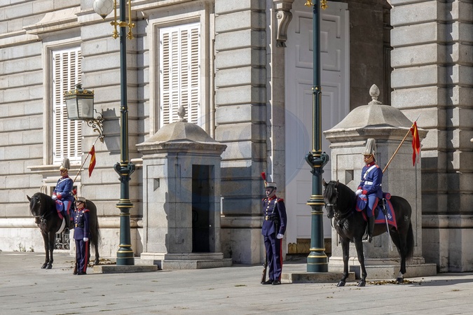 Spain, Madrid, Royal Guard at the East gate of Royal Palace of Madrid Palacio Real in Plaza de Oriente Square, Credit:Fabio Mazzarella / Avalon