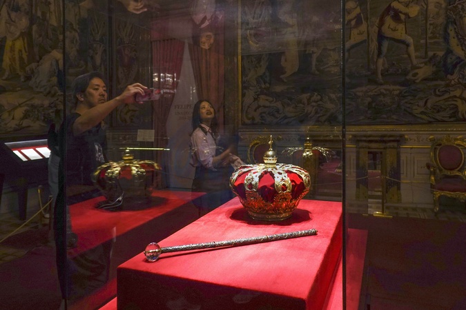 Spain, Madrid, Royal Palace of Madrid Palacio Real, Scenic close up of the royal crown inside the museum of the Royal palace, Credit:Fabio Mazzarella / Avalon