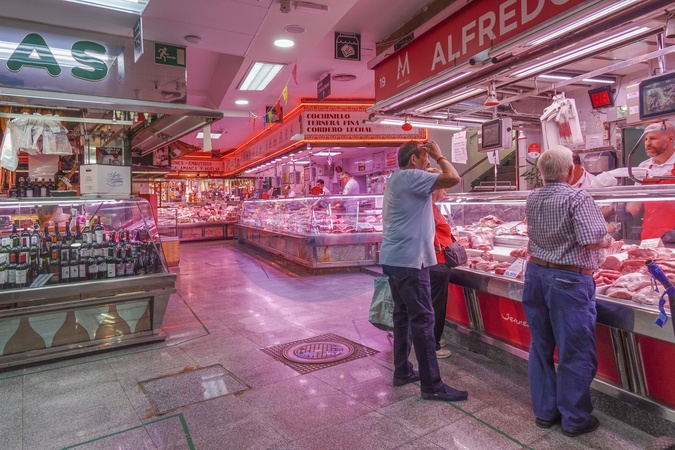 Spain, Madrid, inside view of Anton Martin market, butcher grocer, food market, tourism, Credit:Fabio Mazzarella / Avalon