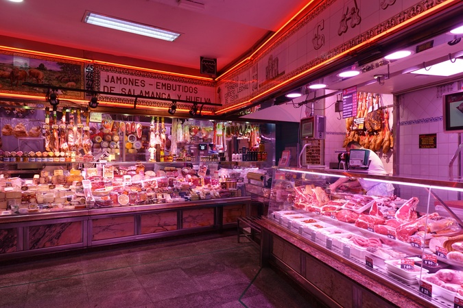 Spain, Madrid, inside view of Anton Martin market, butcher grocer, food market, tourism, Credit:Fabio Mazzarella / Avalon