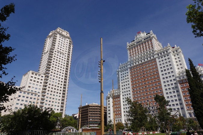 Spain, Madrid, Plaza de Espana, to the left Torre de Madrid and to the right Edificio Espana, Spain Building, now Hotel Riu Plaza Espana, tourism, Credit:Fabio Mazzarella / Avalon