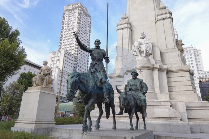 Spain, Madrid, Plaza de Espana, Sculptures of Don Quixote and Sancho Panza at the Cervantes monument, tourism, Credit:Fabio Mazzarella / Avalon