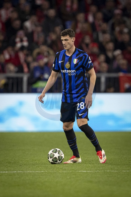 Mariage - Benjamin Pavard et Kleofina Pnishi se sont mariés en Italie - Benjamin Pavard 28 - Match de Ligue Des Champions 2024-2025 (LDC) "Bayern Munich - Inter Milan (1-2)" à l'Allianz Arena, le 8 avril 2025. 2024-2025 Champions League (CL) match "Bayern Munich - Inter Milan (1-2)" at the Allianz Arena, April 8, 2025.