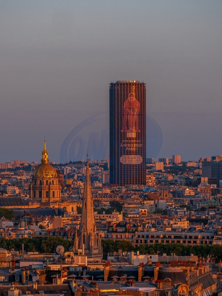 Photo de la tour Montparnasse et de Paris prise depuis le toit de l'Arc de Triomphe un soir d'heure dorée avec le grand Léon Marchand sur la tour Montparnasse à l'occasion des JO Paris 2024. © Theo Castillon / Bestimage