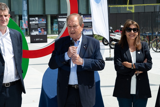 Visite du Centre Aquatique Olympique Métropole du Grand Paris à Saint-Denis, en présence de Kirsty Coventry la Présidente du Comité International Olympique (CIO), de Marie Barsacq Ministre des Sports, d'Amélie Oudéa-Castéra Présidente du Comité National Olympique et Sportif Français (CNOSF), et de Thomas Bach ancien Président du Comité International Olympique (CIO), le 26 juillet 2025. © Jonathan Jacob / Bestimage Visit to the Olympic Aquatic Center Metropolis of Greater Paris in Saint-Denis for the 1st anniversary of the 2024 Olympic Games in Paris on 26/07/2025