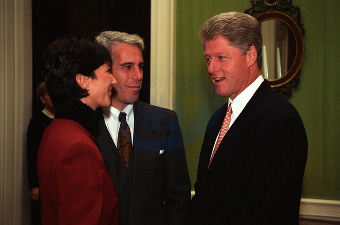 Jeffrey Epstein and Ghislaine Maxwell speak with US President Bill Clinton after the president made remarks at an event for donors to the White House restoration project, Washington DC, USA, 29 September 1993., Credit:Ralph Alswang/The White House / Avalon
