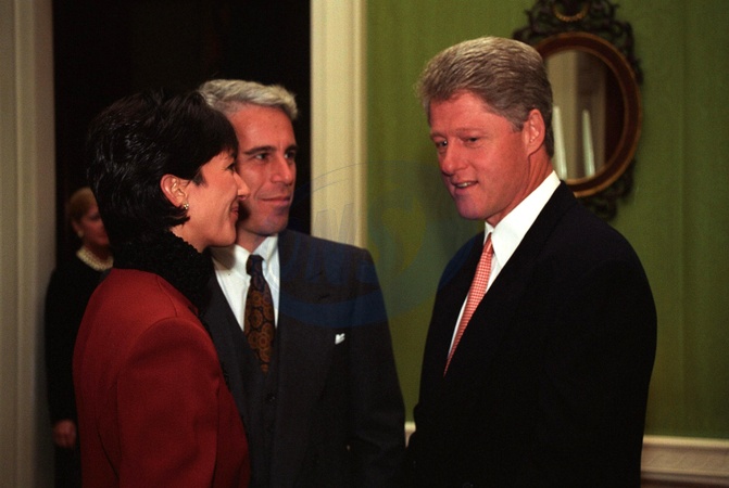 Jeffrey Epstein and Ghislaine Maxwell speak with US President Bill Clinton after the president made remarks at an event for donors to the White House restoration project, Washington DC, USA, 29 September 1993., Credit:Ralph Alswang/The White House / Avalon