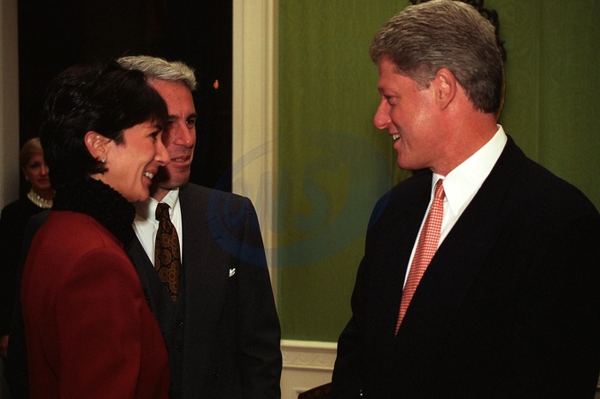 Jeffrey Epstein and Ghislaine Maxwell speak with US President Bill Clinton after the president made remarks at an event for donors to the White House restoration project, Washington DC, USA, 29 September 1993., Credit:Ralph Alswang/The White House / Avalon