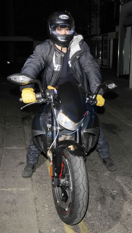 Orlando Bloom odjezdza motocyklem z The Groucho Club, Londyn