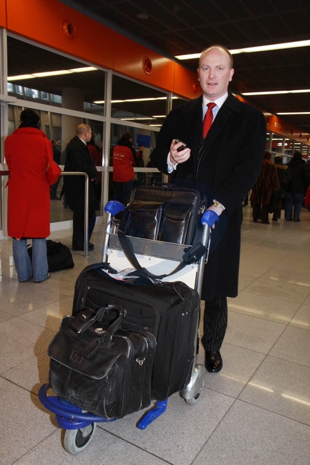 Zalozyciel organizacji Libertas, przeciwnik Traktatu z Lizbony, na lotnisku w Warszawie