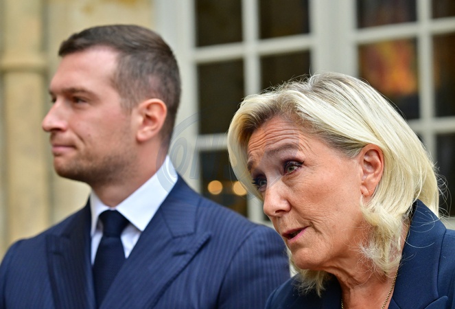Jordan Bardella i Marine Le Pen po spotkaniu z premierem w ramach konsultacji politycznych w paryskim Hôtel de Matignon.