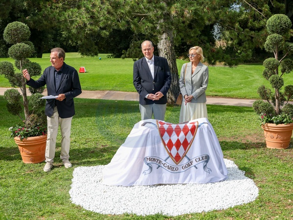 Exclusif - No Tabloïds - Michel Dotta (nouveau président du Monte-Carlo Golf Club), le prince Albert II de Monaco et Sophie Rey (femme du défunt) lors de l'inauguration d'une pierre commémorative à Henry Rey (président du Monte-Carlo Golf Club de 1994 à 2025) au Monte-Carlo Golf Club de Monaco, ce mardi 2 septembre2025 à 11h30. © Claudia Albuquerque/Bestimage Exclusive - No Tabloïds - No Mail Online - Only for OK, Hello, Grazia in UK - Prince Albert II of Monaco at the inauguration of a commemorative stone for Henry Rey at the Monte-Carlo Golf Club in Monaco, this Tuesday, September 2, 2025 at 11:30 a.m. © Claudia Albuquerque/Bestimage