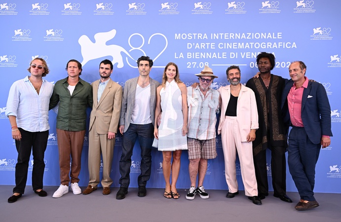 Louis Cancelmi, Vito Schnabel, Benjamin Clementine, Louise Kugelberg, Julian Schnabel, Oscar Isaac, Duke Nicholson, Francesco Melzi d'Eril, Olmo Schnabel during "In the hand of Dante" photocall - The 82nd Venice International Film Festival, Venice, Italy 03 Sept 2025, Credit:Maria Laura Antonelli / Avalon