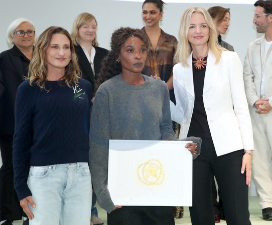 Camille Cottin, Torishéju Dumi, Lauréate du Prix du Savoir-Faire et Delphine Arnault (Présidente du LVMH Prize) - LVMH Prize 2025 à la Fondation Vuitton à Paris le 02 Septembre 2025. © Bertrand Rindoff / Bestimage No web pour la Belgique et la Suisse LVMH Prize 2025 at the Vuitton Foundation in Paris, France on September 3rd, 2025.