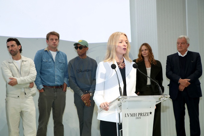 Delphine Arnault (Présidente du LVMH Prize) devant Nicolas Ghesquière, Jonathan Anderson, Pharrell Williams, Stella McCartney et Sidney Toledano - LVMH Prize 2025 à la Fondation Vuitton à Paris le 02 Septembre 2025. © Bertrand Rindoff / Bestimage No web pour la Belgique et la Suisse LVMH Prize 2025 at the Vuitton Foundation in Paris, France on September 3rd, 2025.