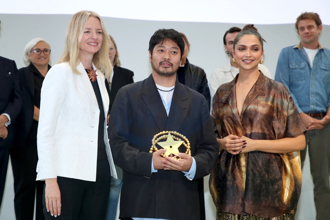 Delphine Arnault (Présidente du LVMH Prize), Sosh Otsuki, Lauréat du Prix LVMH et Deepika Padukone - LVMH Prize 2025 à la Fondation Vuitton à Paris le 02 Septembre 2025. © Bertrand Rindoff / Bestimage No web pour la Belgique et la Suisse LVMH Prize 2025 at the Vuitton Foundation in Paris, France on September 3rd, 2025.