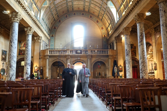 BIRMINGHAM, ENGLAND - SEPTEMBER 03: King Charles III, The Very Reverend Ignatius Harrison, Daniel Joyce, Newman Archivist and Librarian, Birmingham Oratory and Reverend Anton Guziel walk inside The Oratory of St. Philip Neri during a tour of The Oratory of St. Philip Neri following the canonisation of Cardinal John Henry Newman on September 03, 2025 in Birmingham, England., Credit:Chris Jackson / Avalon