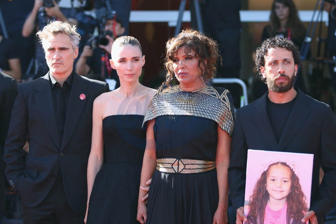 Europe, Italy, Lido di Venezia, September 03, 2025: (L) Joaquin Phoenix, Rooney Mara, the director Kaouther Ben Hania and Motaz Malhees attend a red carpet for the movie 'The voice of Hind Rajab' during the 82nd Venice International Film Festival on September 03, 2025, in Venice, Italy., Credit:Ottavia Da Re / Avalon