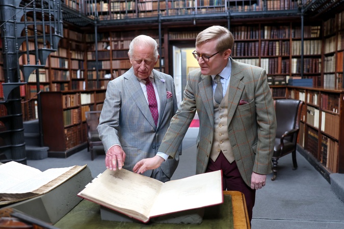 BIRMINGHAM, ENGLAND - SEPTEMBER 03: Daniel Joyce, Newman Archivist and Librarian, Birmingham Oratory (R), shows King Charles III (L) historic items in the library during a tour of The Oratory of St. Philip Neri following the canonisation of Cardinal John Henry Newman on September 03, 2025 in Birmingham, England., Credit:Chris Jackson / Avalon