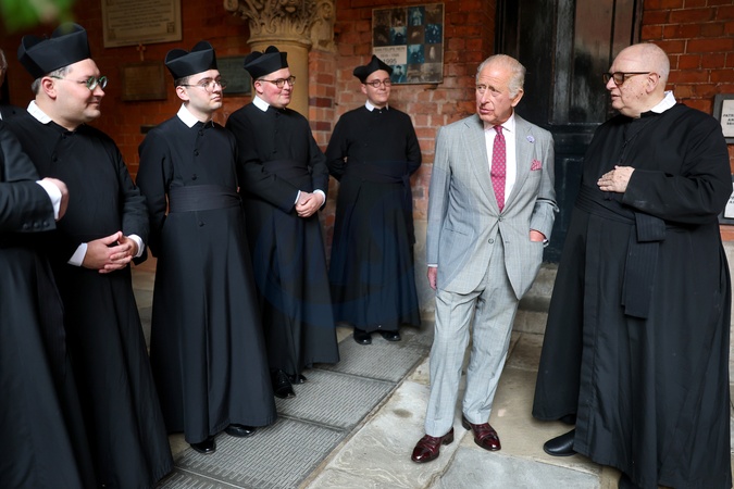 BIRMINGHAM, ENGLAND - SEPTEMBER 03: King Charles III and The Very Reverend Ignatius Harrison talk with Fathers during a tour of The Oratory of St. Philip Neri following the canonisation of Cardinal John Henry Newman on September 03, 2025 in Birmingham, England., Credit:Chris Jackson / Avalon