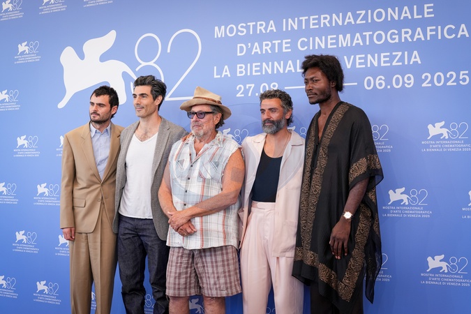 Duke Nicholson, Louis Cancelmi, Julian Schnabel, Oscar Isaac and Benjamin Clémentine attend the "In The Hand Of Dante" photocall during the 82nd Venice International Film Festival in Venice, Italy on 03 September 2025., Credit:Stefano Costantino / Avalon