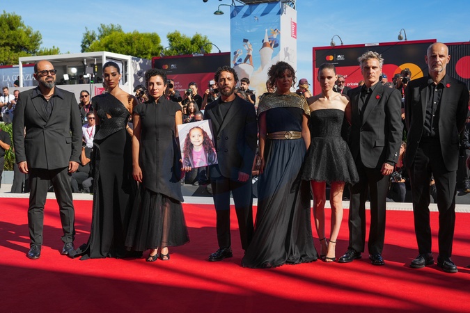 Amer Hlehel, Saja Kilani, Clara Khoury, Motaz Malhees, Kaouther Ben Hania, Rooney Mara, Joaquin Phoenix and James Wilson attending the The Voice Of Hind Rajab red carpet during the 82nd Venice International Film Festival on September 3, 2025 in Venice, Italy. (Photo by Lucia Sabatelli / Bestimage) EDITORIAL USE ONLY